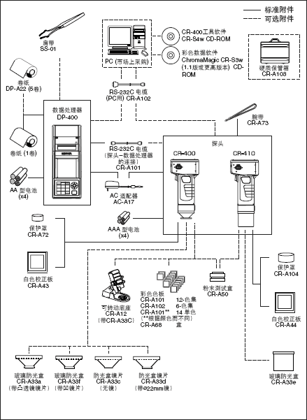 | 另售配件 | 硬盒CR-A103、RS-232C線纜CR-A102(連接PC)、粉體單元CR-A50、CR-400實(shí)用軟件CR-S4w、色彩管理軟件SpectraMagic NX CM-S100w、帶玻璃罩的遮光筒CR-A33a/f、CR-A33c/d遮光筒、測(cè)量頭托架CR-A12、彩色瓦片 | 硬盒CR-A103、RS-232C線纜CR-A102(連接PC)、粉體單元CR-A50、CR-400實(shí)用軟件CR-S4w、色彩管理軟件SpectraMagic NX CM-S100w、帶玻璃罩的遮光筒CR-A33e |